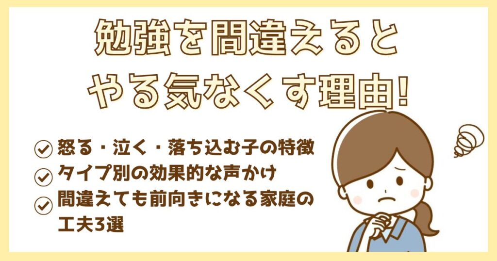 うちの子、勉強してても間違えたらすぐ泣いちゃう… うちはちょっと注意しただけでイライラして怒るし、落ち込むし…もうどうしたらいいの? 子どもが勉強を間違えるたびに、怒ったり泣いたりしてやる気なくす姿を見るのは、親として本当につらいですよね。で... -