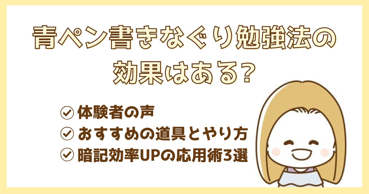 この記事では青ペン書きなぐりの効果と、おすすめの道具ややり方を解説します。さらに暗記効率が上がる方法もご紹介します。