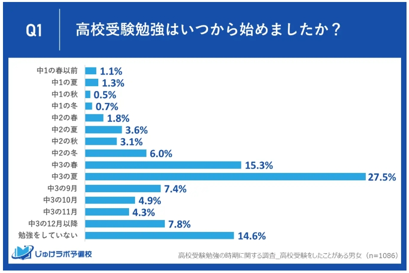 2022年に行われたじゅけラボ予備校の調査によると、中学生の約67%が「中3の春〜夏ごろから」本格的に受験勉強を始めています。