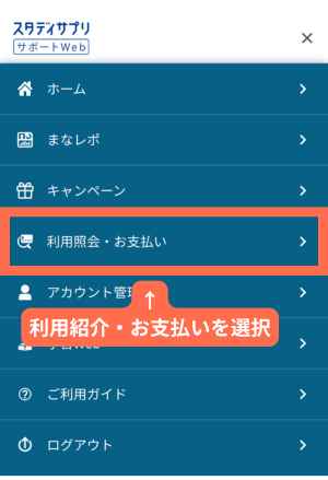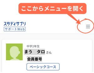 ①スタディサプリサポートWEBよりメニューを開く