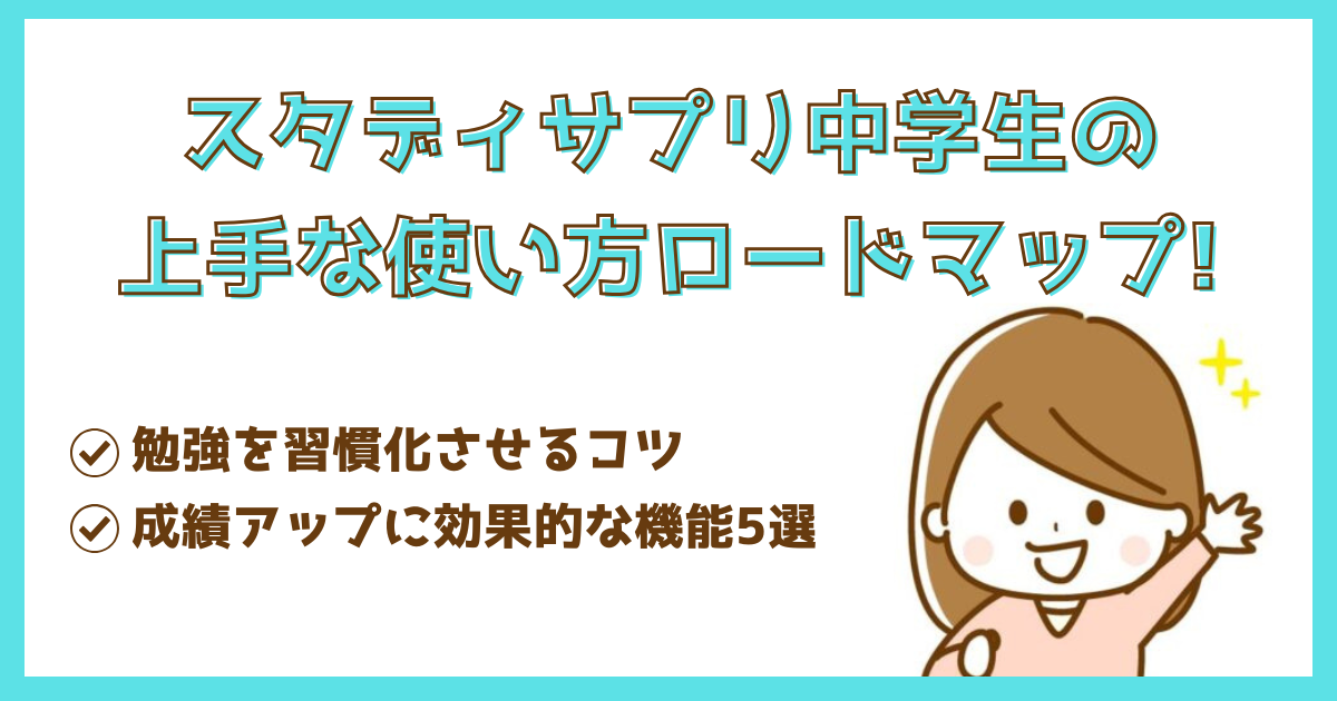 スタディサプリ中学生の上手な使い方ロードマップは「スタディサプリを使いながら勉強習慣を身に付ける→スタディサプリの機能を効率的に使う→成績アップ!」という流れです。