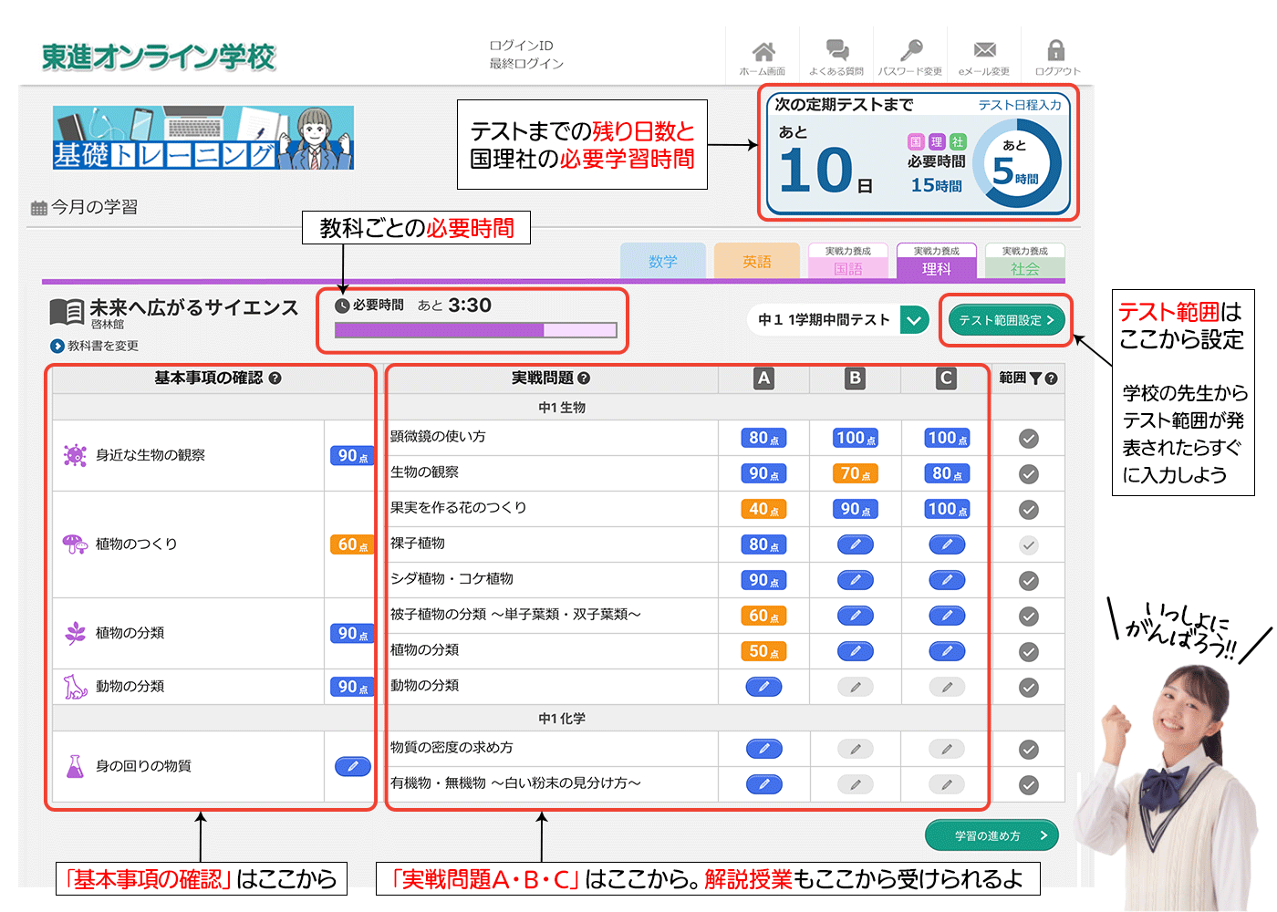 - 定期テスト対策講座は、中学校で使用の教科書範囲を入力するだけで学習計画が提示され、効率的に90点以上を目指せる