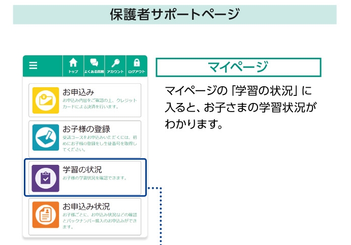 「保護者サポートページ」では、学習状況をいつでも確認できるのが大きな魅力でポイントです。